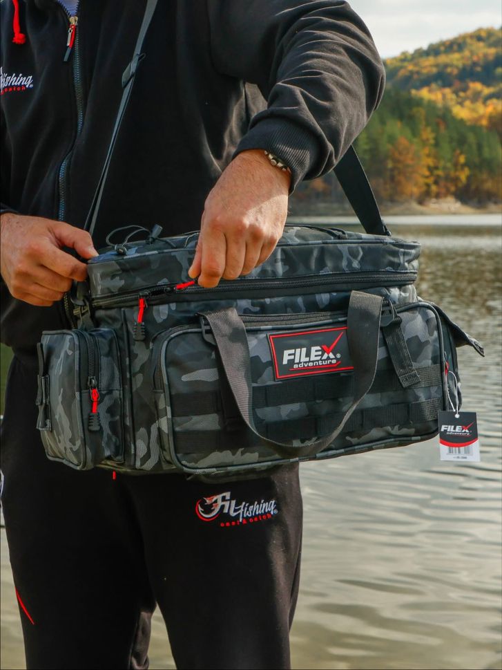 Серията чанти Filex Adventure осигурява отлично качество, издръжливост и защита за вашата екипировка и аксесоари. Изработена от материал "900D PU", който е водоустойчив и лесен за почистване след употреба. Тази чанта е многофункционална за спининг, фидер, риболов на шаран или друг стил риболов. Изработена в цветовата гама "ADVENTURE CAMO". Оборудвана със здрава регулируема презрамка и дръжки за носене. Подсилено дъно на чантата за по-голяма устойчивост на износване. Разполага с много помощни аксесоари, като например държач за клещи, пръчка или мрежа отгоре за кутията... Отличен вариант с отлично съотношение цена-качество.